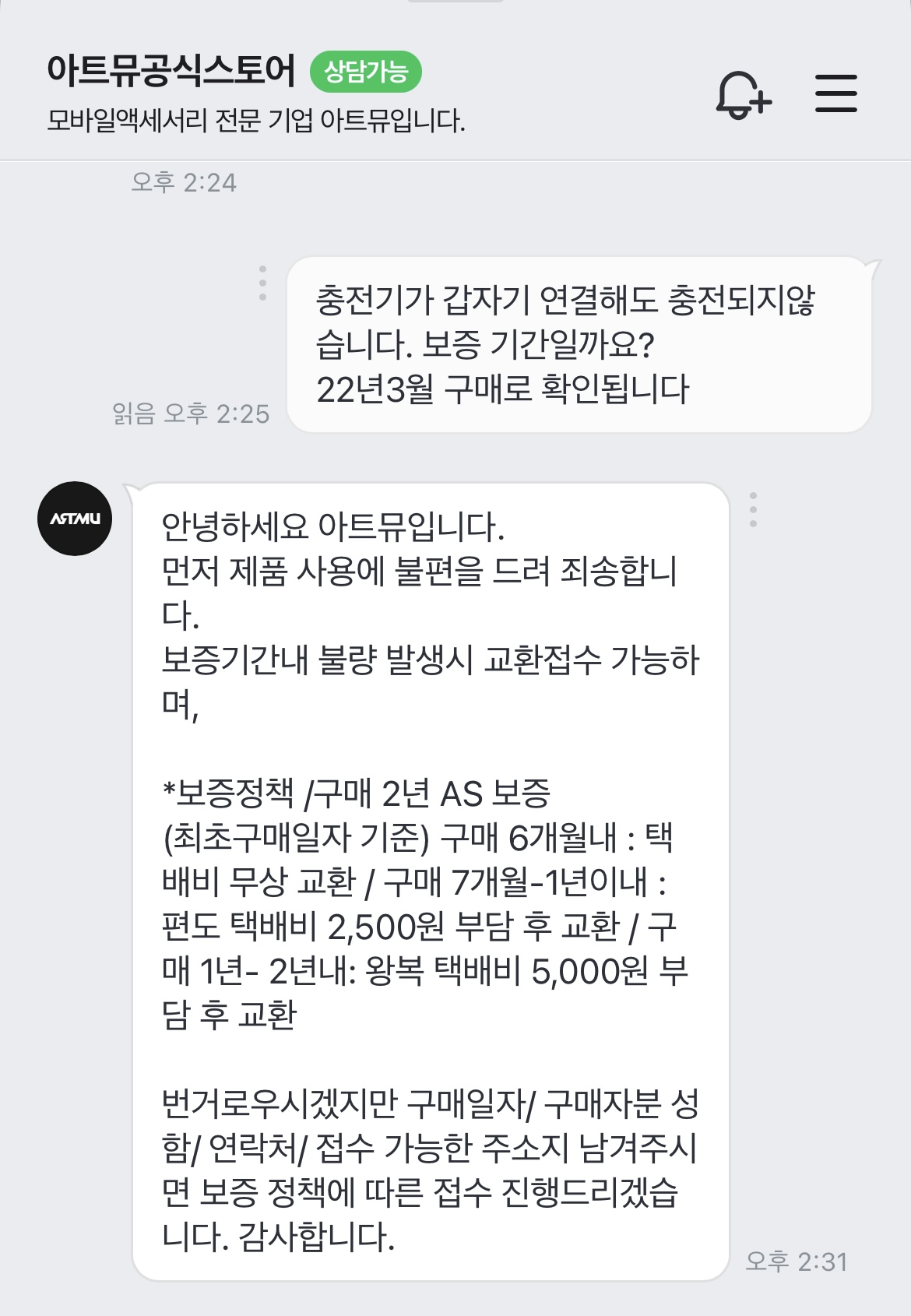간단한 연락처(주소/이름/전화번호) 기입 후 발송하였고 아주 빨리 새제품(23년 6월 제조품)이 도착하였다.