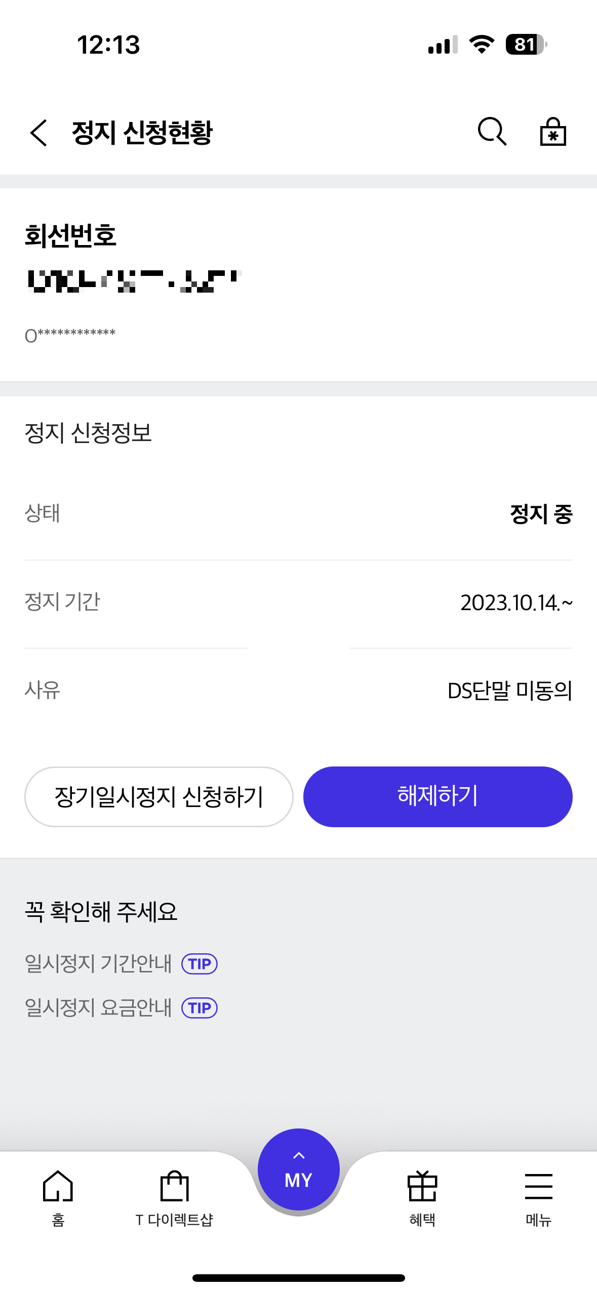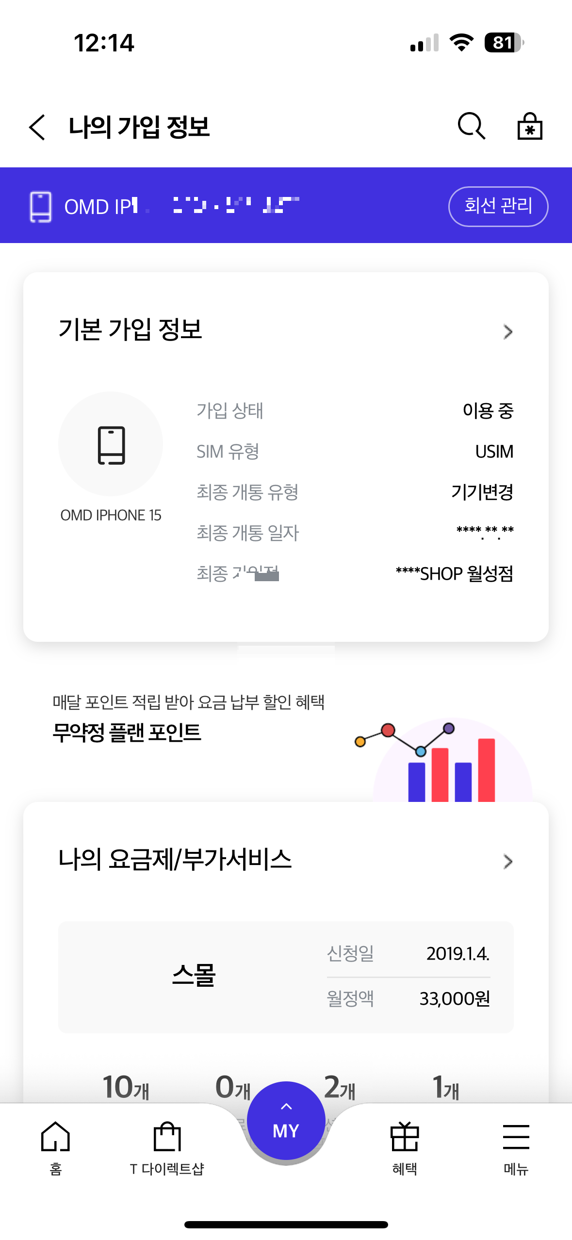 Tworld 에 나의가입정보 확인 해 보니 ‘가입상태’ 가