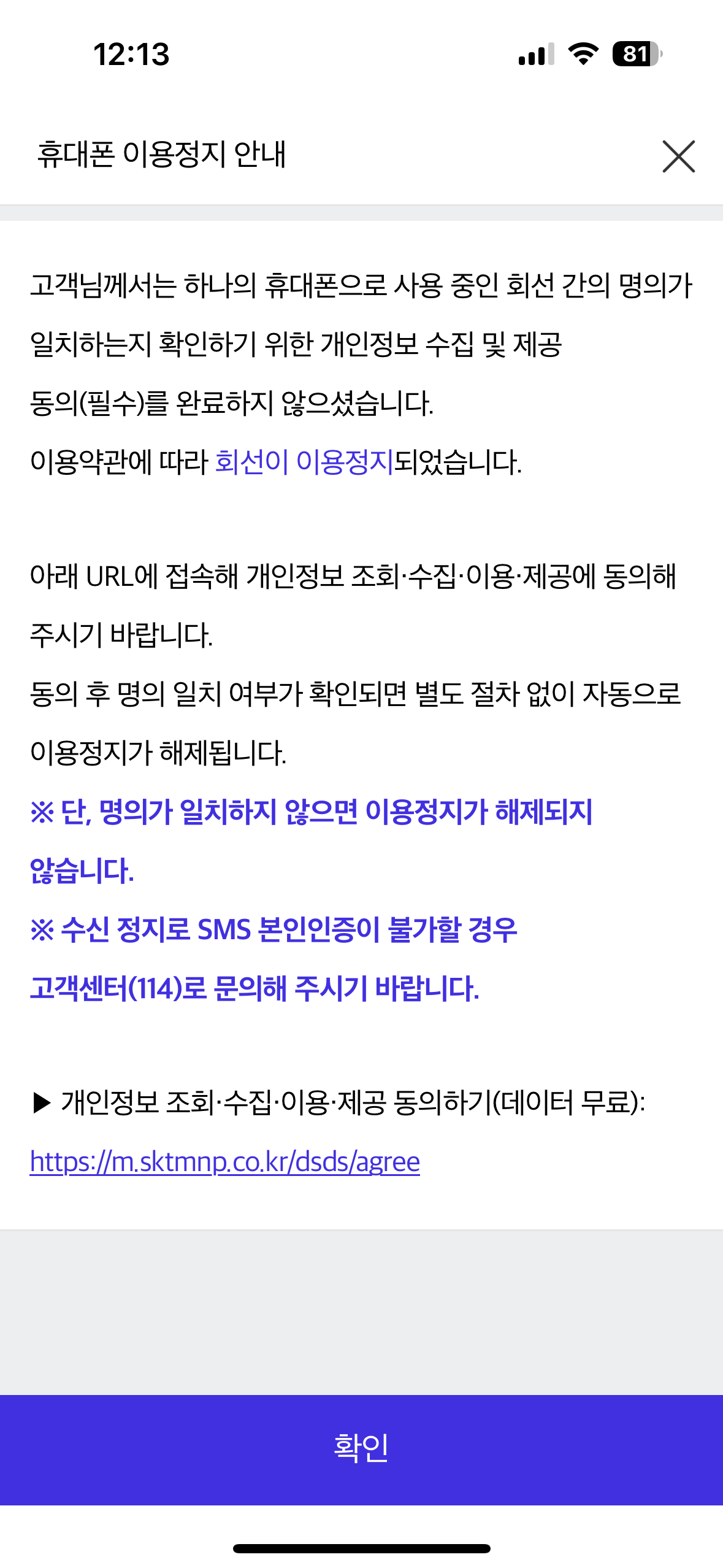 Sms 동의 완료 후 ‘이용 중’ 으로 바뀌었고 발신제한이 해제 되었다.