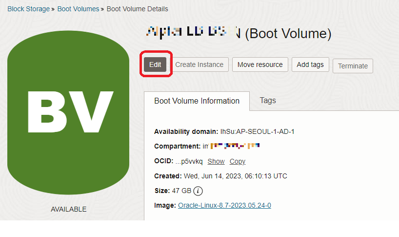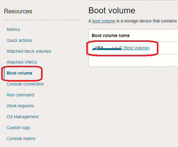 : OCI 콘솔 -> instances -> 해당 instance -> 좌측 하단 boot volume -> 볼륨 선택