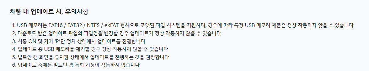 - 이때 USB 는 안내된 형식으로 포맷 되어있어야 한다. 다른 파일시스템으로 포맷된 경우, 차량에서 인식 되지 않는다.