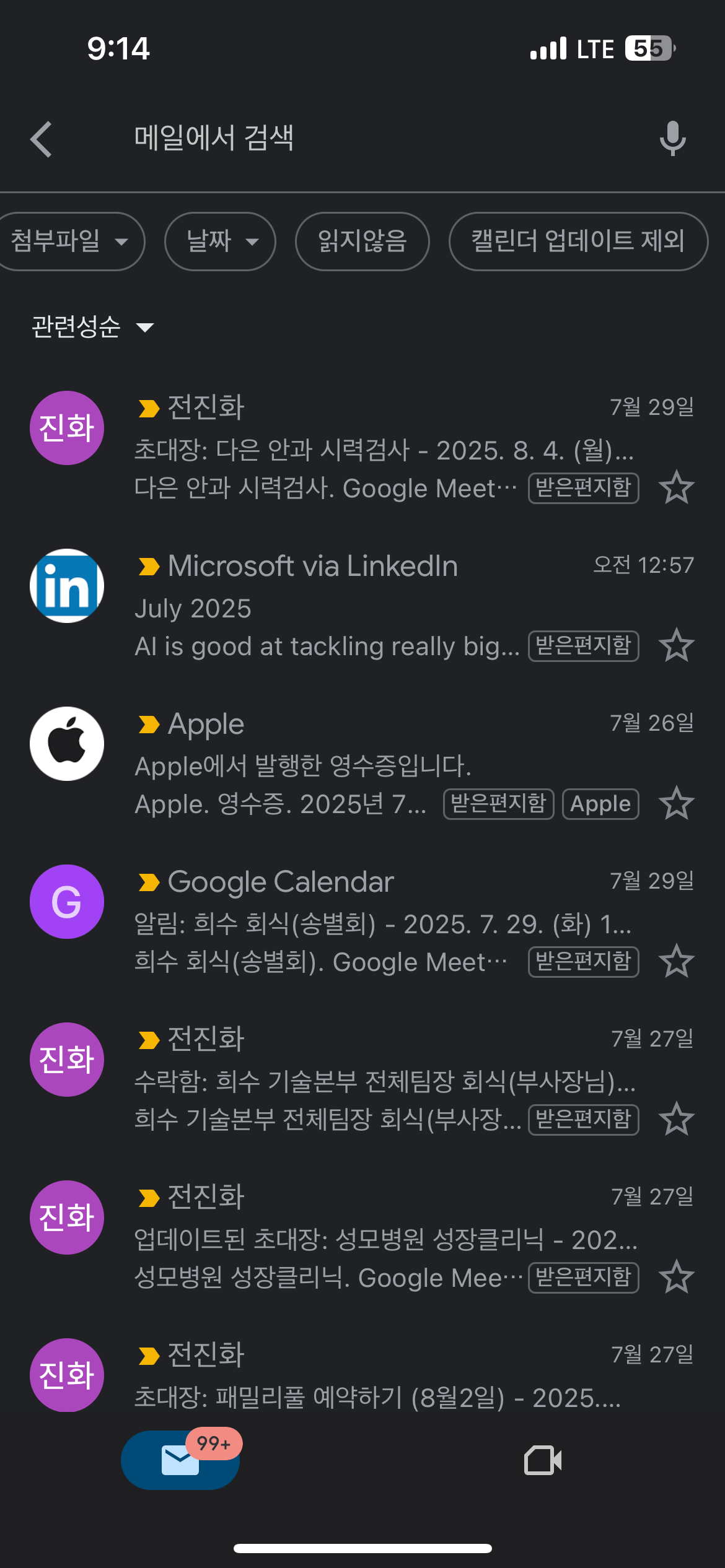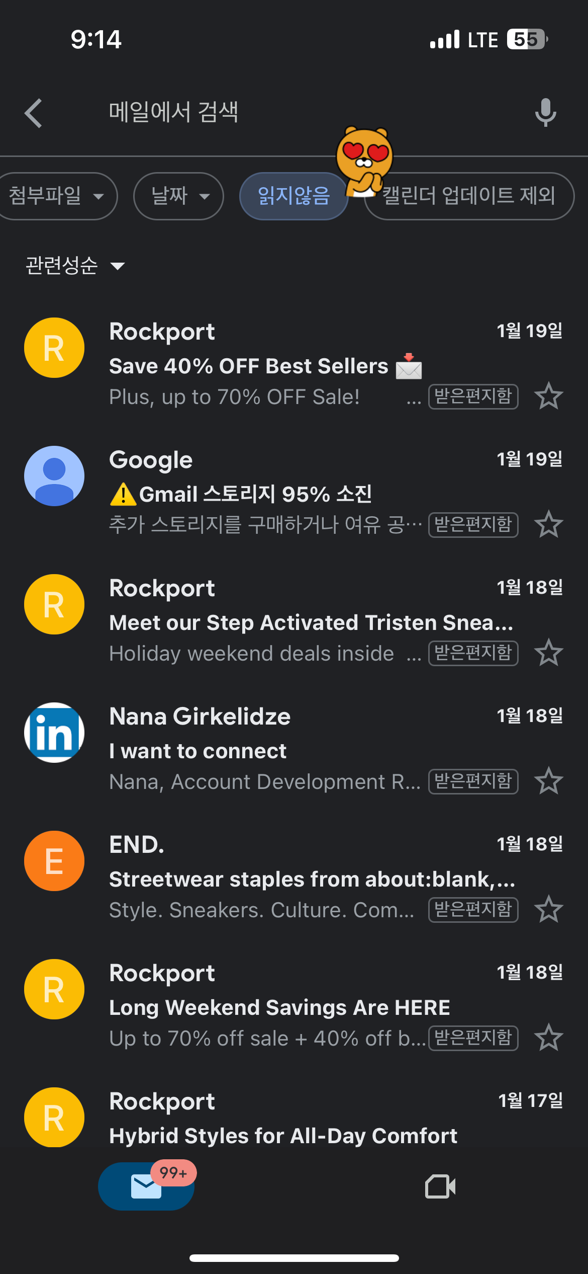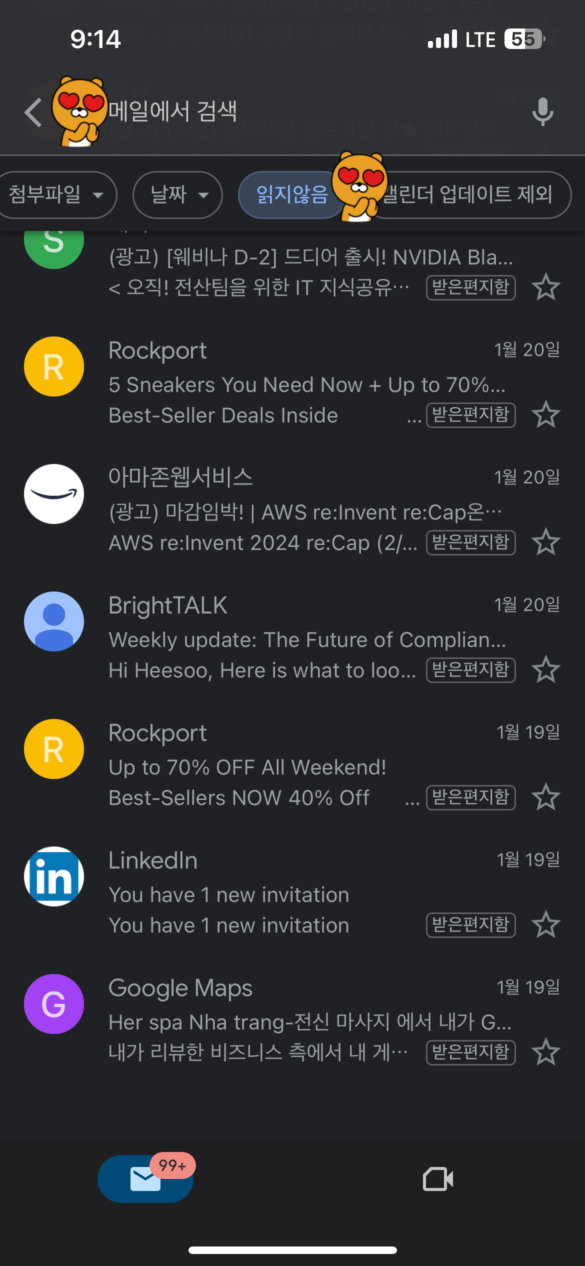 그런데, '읽지 않음' 메일을 필터링 해서 검색을 해야 하는데 검색하는 방법은 아래와 같다.