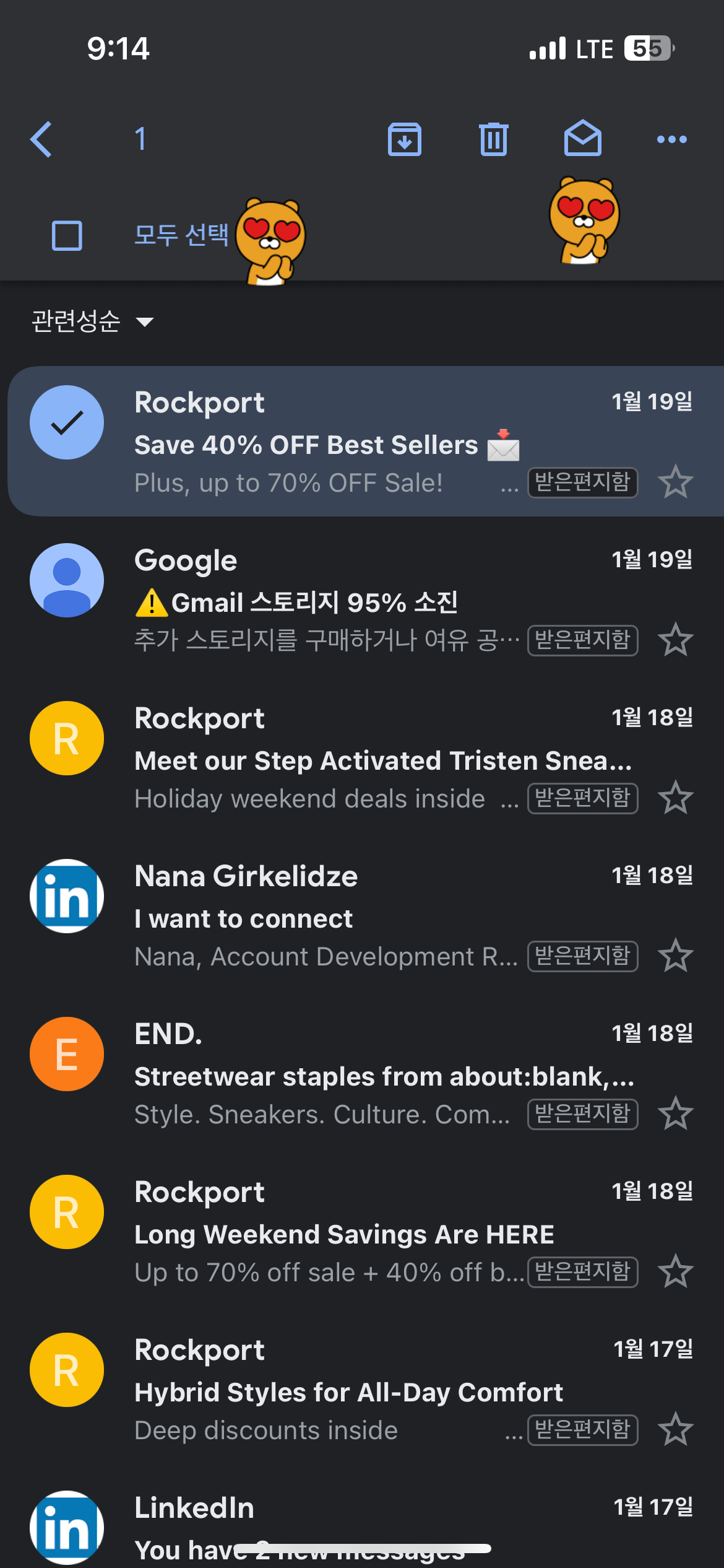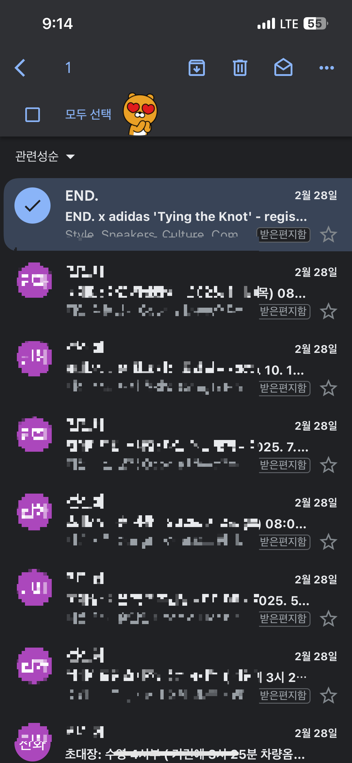 - 먼저 메일을 꾸욱~ 1초간 클릭하고 있으면 아래 그림처럼 메일을 선택 할 수 있는 화면으로 변환 된다. 그러면 '모두 선택' 이라는 메뉴가 위에 나오는데, 이 방법을 사용하면 될 것 같다!